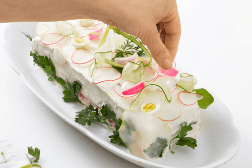 Украсить огурцом, редиской, спаржей, зеленью, отварными перепелиными яйцами и маринованным луком.