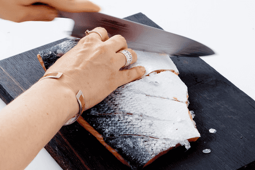 Удалить чешую с лосося, но кожу не снимать. Сделать несколько разрезов на коже, чтобы маринад легче проник внутрь.