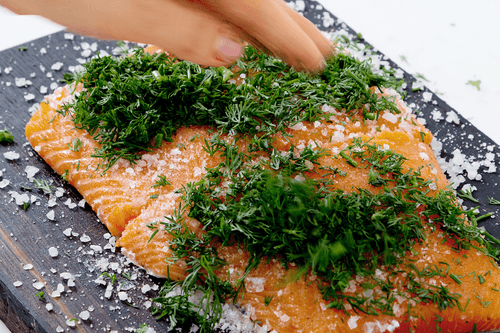 Смешать морскую соль, три столовые ложки сахара, белый перец и этой смесью посыпать филе с обеих сторон. Укроп мелко нарезать и половиной его посыпать рыбу, оставшийся укроп отложить для салата и соуса.