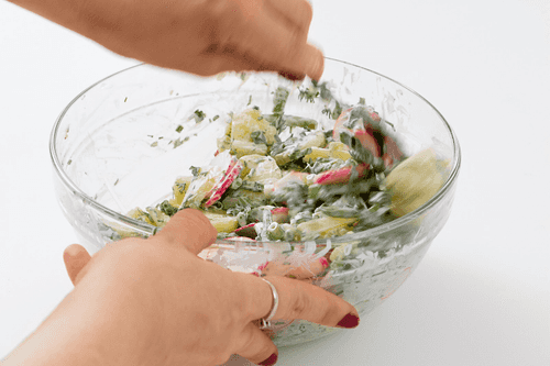 Смешать сметану, майонез, одну столовую ложку горчицы, по три столовых ложки рубленых укропа и петрушки для заправки. Посолить и поперчить, смешать с овощами.