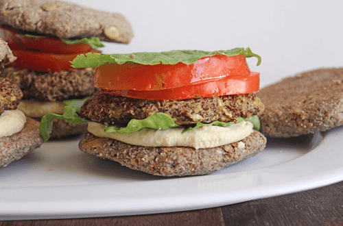Осталось собрать бургер! На нижнюю булочку можно намазать хумус, сверху положить листья салата, затем котлету и ломтики помидоров.