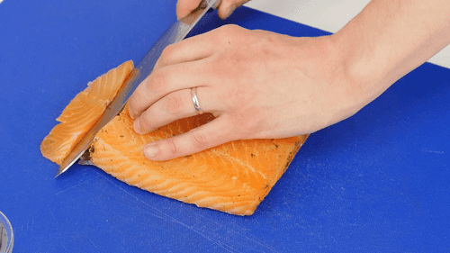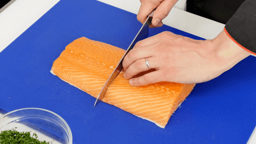Филе лосося разрезать напополам. Сделать на коже несколько неглубоких надрезов.