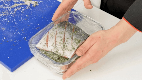 В подходящую емкость положить один кусок рыбы кожей вниз, сверху положить второй, кожей вверх. Накрыть пленкой и оставить при комнатной температуре на 3 часа. Затем убрать в холодильник.
