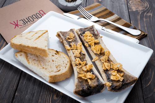 Запеченные мозговые кости – это традиционное блюдо русской кухни, отличающееся насыщенным, маслянистым вкусом с нежной текстурой. В старину мозговые кости запекали в русской печи, считая их деликатесом. Запекание придаёт костному мозгу сливочную мягкость, а карамелизированный луковый конфитюр добавляет сладковато-пряную ноту. Соус «Чимичурри» на основе болгарского перца, трав и уксуса освежает вкус, придавая пикантность. Подача на поджаренных ломтиках белого хлеба делает блюдо сытным и идеально подходящим для неспешной трапезы. Такое угощение отлично сочетается с бокалом сухого красного вина и подается как горячая закуска или основное блюдо. Уникальное сочетание ингредиентов раскрывает все грани вкуса, превращая простые кости в изысканное угощение.