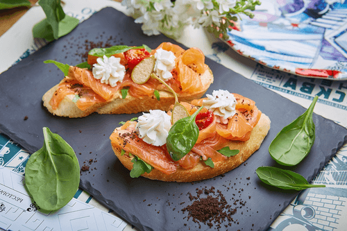 Брускетта со слабосоленым лососем и козьим сыром — изысканный итальянский закусочный шедевр, сочетающий нежность рыбы с пикантностью сыра. Исторически брускетта возникла как способ итальянских крестьян использовать оставшийся хлеб, придавая ему новое звучание с добавлением простых, но насыщенных ингредиентов. В данном варианте сливочный сыр с оттенком кимчи добавляет легкую пряность, а руккола освежает вкус. Нежный козий сыр, прогретый с вином и фетой, придает блюду бархатистую текстуру, а украшение каперсами и подвяленными черри добавляет кисло-сладкие нотки. Крошка из маслин завершает композицию тонким солоноватым послевкусием. Идеальна как элегантная закуска на ужин с бокалом белого вина или как утренний гастрономический восторг. Каждая деталь здесь — гармония традиций и современного кулинарного искусства.