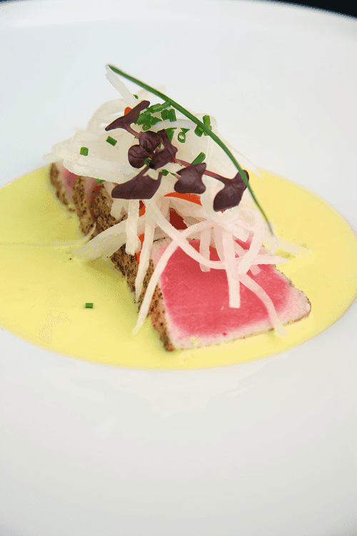 Филе тунца с соусом халапеньо и лапшой из дайкона с чили