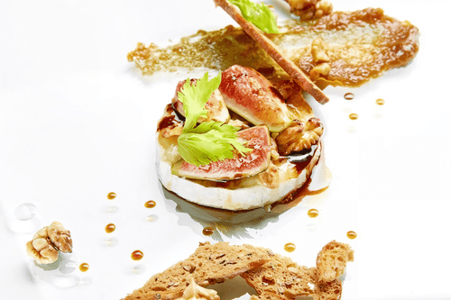 Выложить запеченный сыр на тарелку, украсить листьями сельдерея и кресс-сакурой. Подавать с вареньем из инжира и злаковыми чипсами.