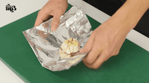 С головки чеснока срезать верхушку, поставить чеснок на фольгу, полить оливковым маслом, завернуть в фольгу и отправить запекаться в духовку, разогретую до 180 градусов, на 45 минут.