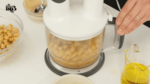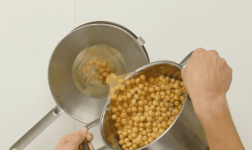 Слить воду от нута в отдельную емкость, она еще пригодится. Нут пересыпать в блендер, оставив несколько горошин для украшения.