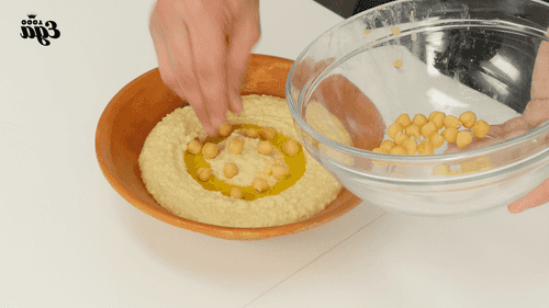 На тарелку выложить готовый хумус, ложкой проделать в нем бороздку по кругу, украсить целыми горошинами, паприкой и оливковым маслом, также можно украсить хумус обжаренными кедровыми орехами.