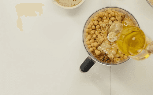 Добавить тхину, оливковое масло, пару ложек отвара, сок половины лимона, печеный чеснок и чесночно-куминовое пюре.