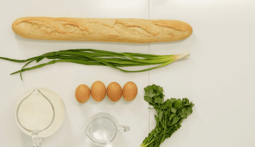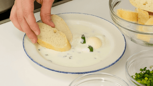 В тарелку положить одно яйцо, налить немного бульона, добавить черствого хлеба.