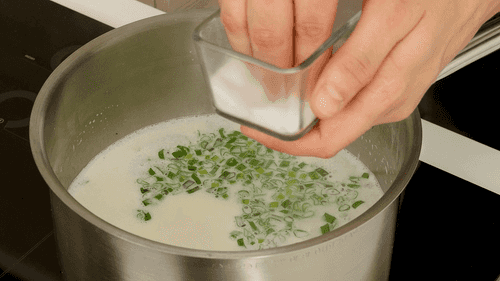Посолить и поперчить, дать покипеть 3 минуты на небольшом огне.