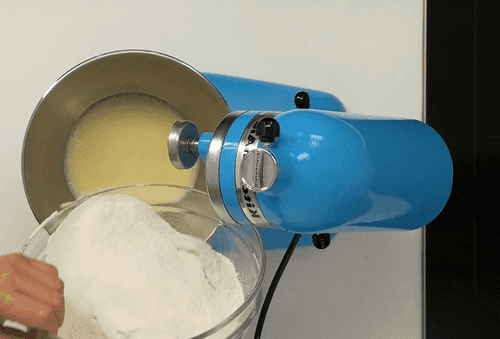 Добавить просеянную муку и замесить тесто. Это можно сделать с помощью миксера, а затем домесить тесто руками. Вылить на стол 20 мл растительного масла и вмесить его в тесто, от масла тесто станет более эластичным.