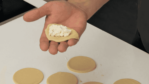 Положить на тесто ложку начинки и плотно слепить края теста, стараясь не оставлять внутри вареников воздух. Готовые вареники складывать на подпыленную мукой поверхность.
