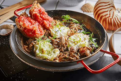 Яичница с морепродуктами — это яркое блюдо, которое можно встретить в меню ресторанов Barceloneta в Сочи и Barceloneta Tapas Bar в «Депо». Это кулинарное творение сочетает в себе нежность яиц и насыщенный вкус свежих морепродуктов, создавая гармоничное единство, которое порадует истинных гурманов. Такое блюдо идеально подходит для того, чтобы насладиться утренним или обеденным приёмом пищи, добавляя к нему нотки средиземноморской атмосферы и свежести.