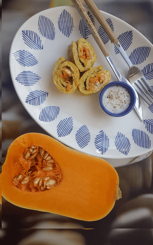 Яичный рулет с пряной тыквой и творожным сыром