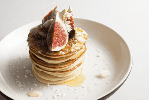 Выложить горку панкейков на тарелку, полить сиропом, посыпать кокосовой стружкой и украсить инжиром.