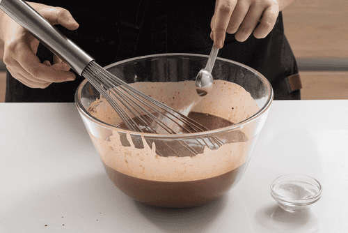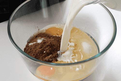 В миске смешать венчиком яйца с молоком, мукой, какао, растительным маслом, солью и 40 граммами сахара.