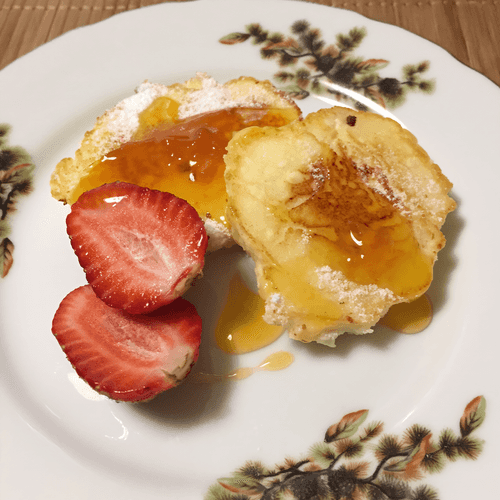 Обжаривать с двух сторон до появления румяной корочки. Подавать с сахарной пудрой, вареньем, клубникой и другими фруктами.