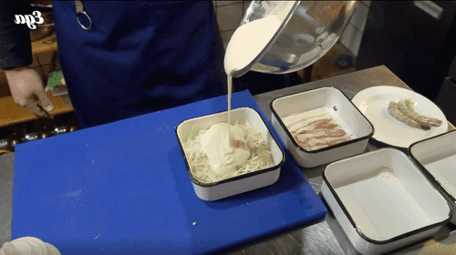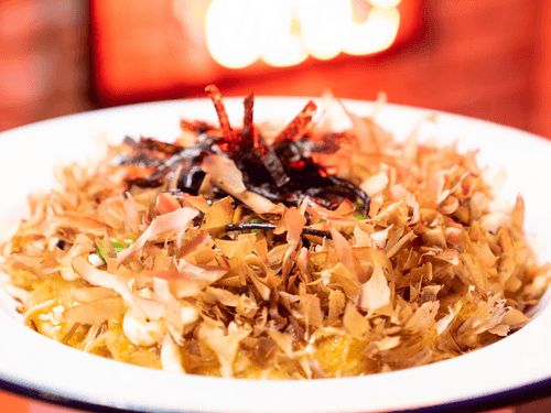 «Окономи» в переводе с японского означает «то, что вы любите», «яки» — «все, что жарится на огне». В самом названии заложена горячая любовь японцев к капустным блинчикам окономияки. Рецепт строится по принципу пиццы: все, что есть на данный момент в холодильнике, может стать частью блинов. Вариантов традиционного приготовления два. Первый — блин из тонкого темпурного теста выпекается отдельно, а потом на него сгружается все остальное (это стиль Хиросимы и Токио). Второй — когда рубленая капуста может замешиваться в тесто, и блин получается толстым, как оладушек, — этот стиль практикуют в Осаке. Но как бы ни складывались отношения теста и капусты, сверху окономияки обязательно украшается завитушками майонеза и шевелящейся стружкой тунца. Рецепт из татиноми-бара «Тебурасика».