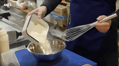 Разбить яйцо в миску, слегка его взбить. Добавить муку, слегка все перемешать, добавить соль.