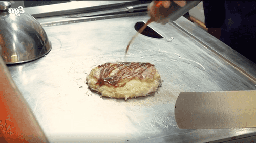 Открыть крышку. Перевернуть окономияки. Полить соусом окономи (по 2 столовых ложки на блин), размазать его кисточкой по поверхности.