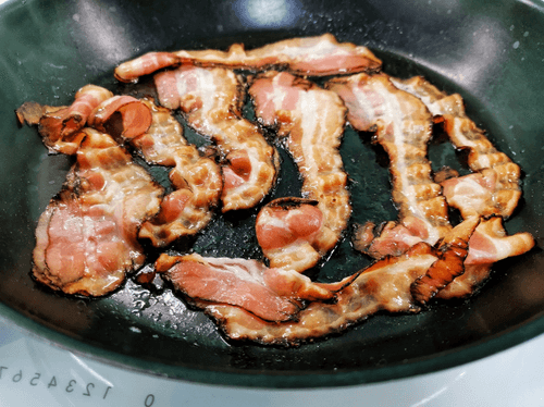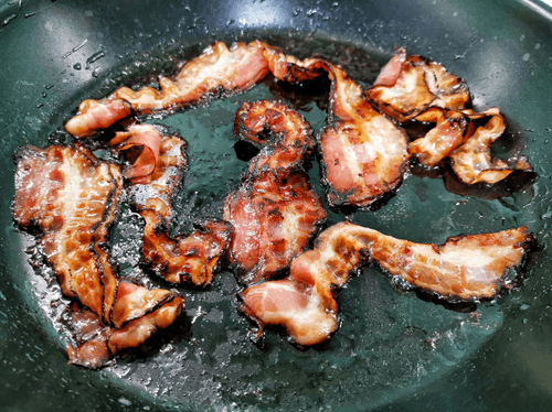 Перевернуть бекон и продолжать жарить на сильном огне.