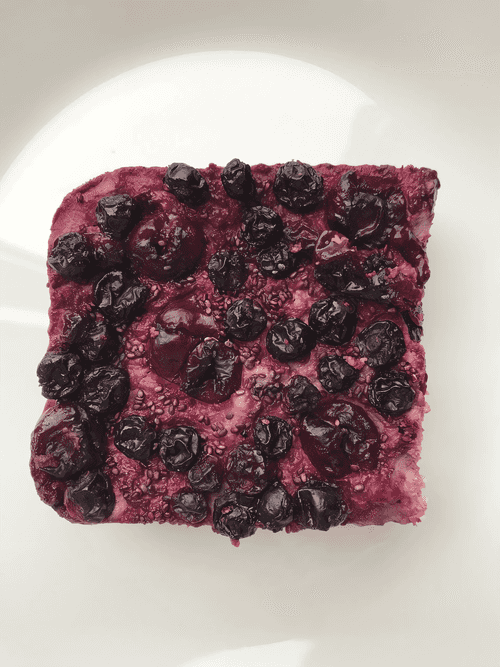 Массу выложить в форму и посыпать сверху замороженными ягодами.