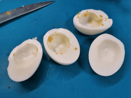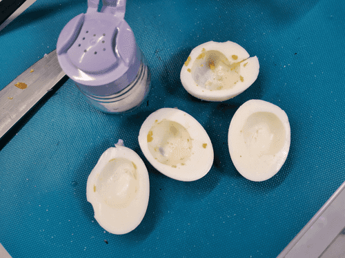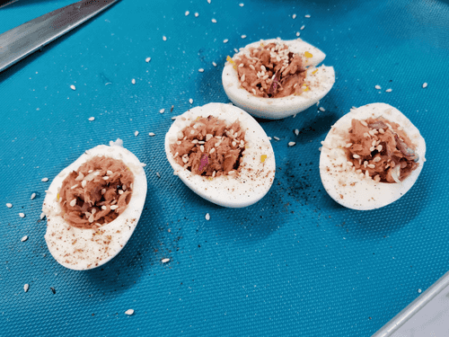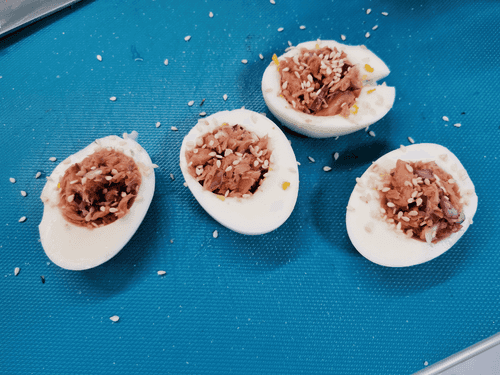 Яйца, фаршированные тунцом, — это простой, но изысканный закусочный вариант, пришедший из европейской кухни. Это блюдо сочетает мягкость варёных яиц с насыщенным вкусом тунца, дополненного хрустящими кусочками красного лука и ароматом чёрного перца. Исторически фаршированные яйца были популярны во многих странах, становясь любимой частью фуршетов и праздничных столов. Лёгкость приготовления и универсальность делают их идеальной закуской для любого случая. Кунжутные семечки придают пикантную нотку, а зелень дополняет свежестью. Эти яйца можно подавать как самостоятельное блюдо или в сочетании с лёгкими салатами, превращая их в гармоничный гастрономический ансамбль.