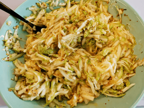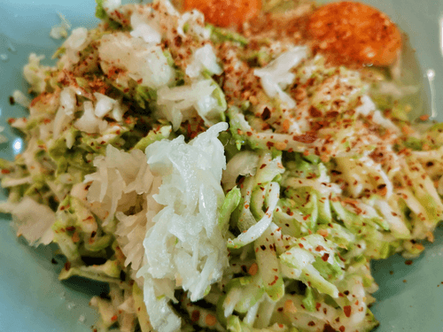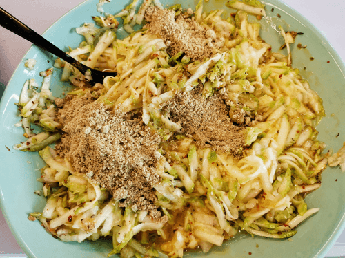 Натереть на мелкой терке лук и отправить к кабачку. Приправить солью и молотым перцем чили.