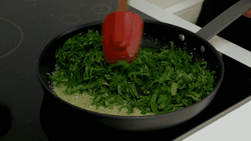 Добавить щавель и шпинат, продолжить жарить, помешивая, пару минут, пока зелень не уменьшится в объеме.