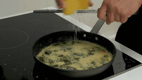 Залить яйцо и жарить на небольшом огне, пока омлет не схватится. Он должен остаться жидковатым сверху.