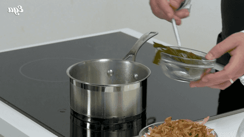 Довести воду с комбу до кипения, затем достать из воды.