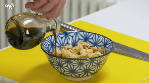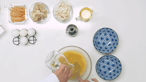 Яйца разбить в миску, добавить соевый соус, мирин, перемешать венчиком, влить бульон, продолжая взбивать.