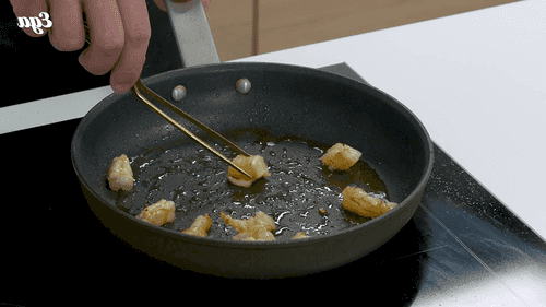 На этой же сковороде обжарить креветки в течение 1–2 минут.