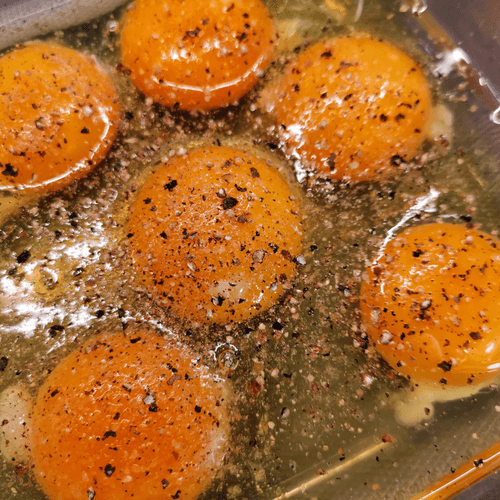 Яйца добавить в жаропрочную форму и приправить смесью перцев.