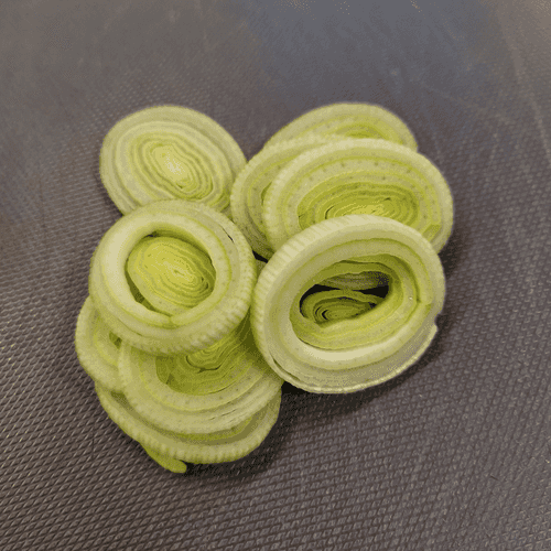 Лук-порей нарезать кольцами толщиной около 0,5 см.