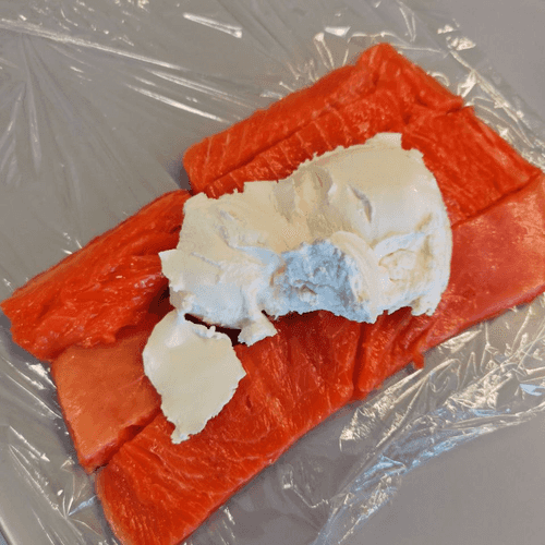 Выложить на пищевую пленку рыбу, смазать ее творожным сыром.
