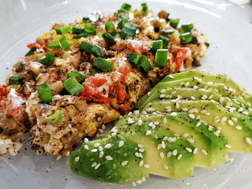 Выложить на блюдо яичницу, присыпать зеленым луком и добавить рядом авокадо. Присыпать кунжутом и посолить.