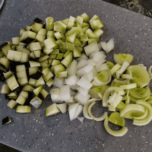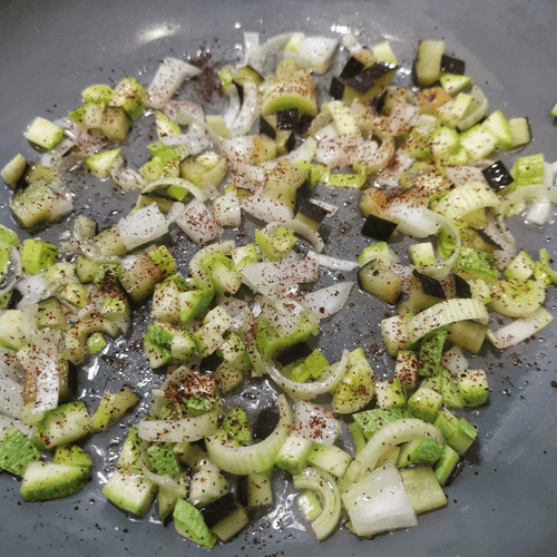 Отправить на разогретую сковороду с маслом лук-порей, репчатый лук, баклажан и кабачок. Добавить сумах и соль. Перемешать.
