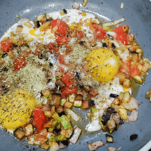 Яичница с тремя видами лука и овощами — это яркое блюдо средиземноморской кухни, сочетающее свежесть и пикантность ароматных ингредиентов. История рецепта корнями уходит в традиционные завтраки этого региона, где овощи и яйца играют главную роль. Блюдо объединяет нежность кабачков, легкую горечь баклажанов, кислинку помидоров и изысканный вкус трех видов лука. Сумах добавляет легкую цитрусовую нотку, а кунжут придаёт ореховый оттенок. В финале зеленый лук и авокадо освежают композицию, дополняя её текстурой и насыщенностью. Яичница получается сочной, ароматной и питательной, отлично подходит для лёгкого завтрака или позднего ужина. Она легко готовится, насыщает и дарит ощущение уюта. Уникальное сочетание овощей делает блюдо универсальным, а его богатый вкус порадует любителей средиземноморской кухни.
