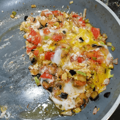Перемешать ингредиенты и сдвинуть яичницу на одну середину сковороды. Снять с огня. Прикрыть крышкой на 2 минуты.