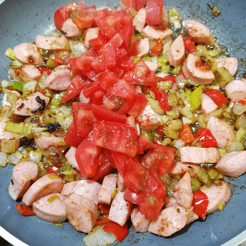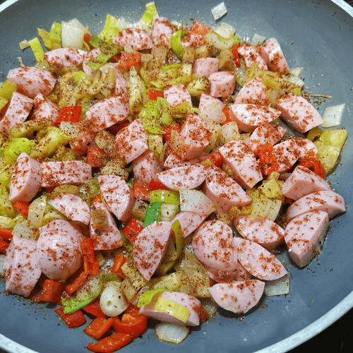 Добавить сосиски, приправить сухой аджикой. Перемешать.