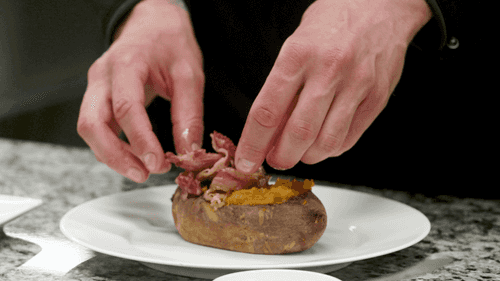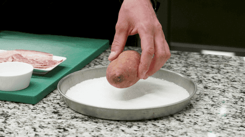 Из бекона свернуть розочку и положить его на батат.