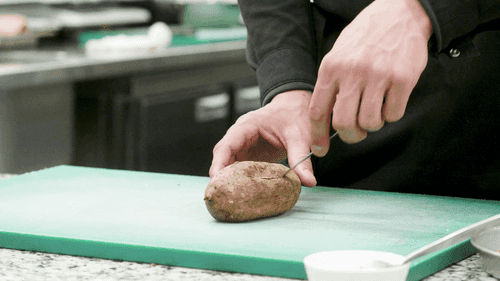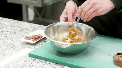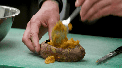 У готового батата срезать верхушку кожуры и аккуратно вынуть мякоть, стараясь не повредить кожуру.