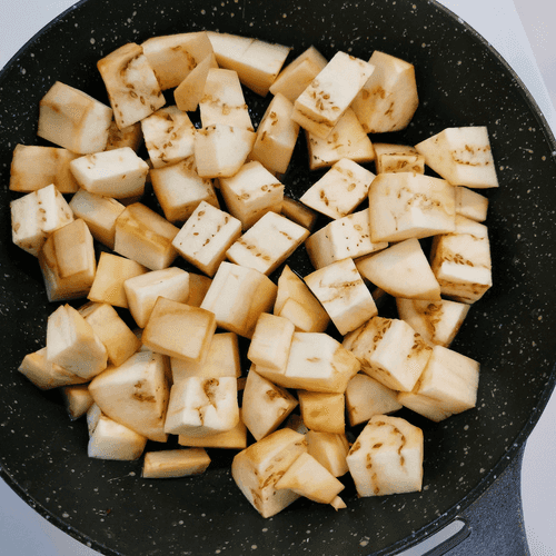 Баклажан очистить и нарезать небольшими кубиками. Отправить в разогретое на сковороде оливковое масло. Обжаривать на сильном огне около 4 минут, затем перемешать.