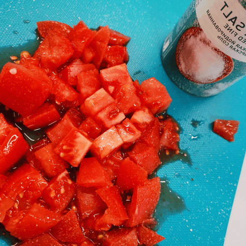 Помидор крупно нарезать и посолить.