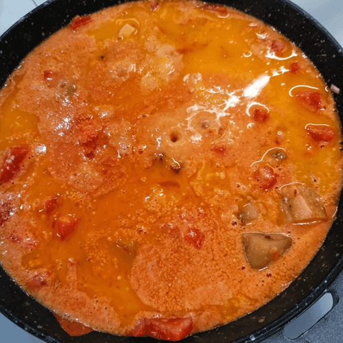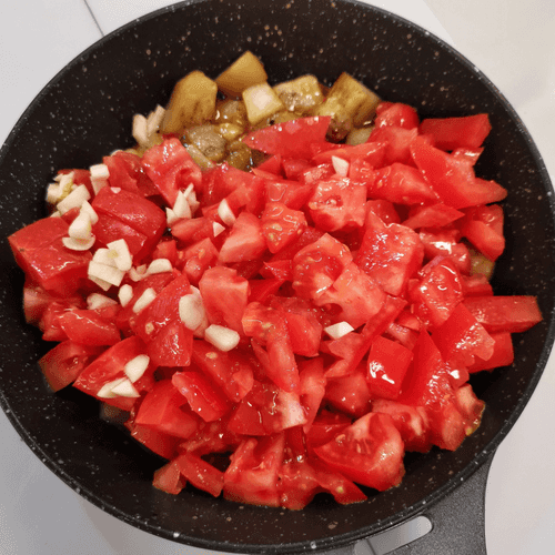 Добавить на сковороду помидоры и чеснок, перемешать и убавить огонь.