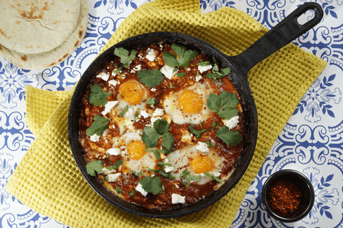 Готовую шакшуку немедленно подать вместе с лепешками. Украсить блюдо кинзой и хлопьями чили.